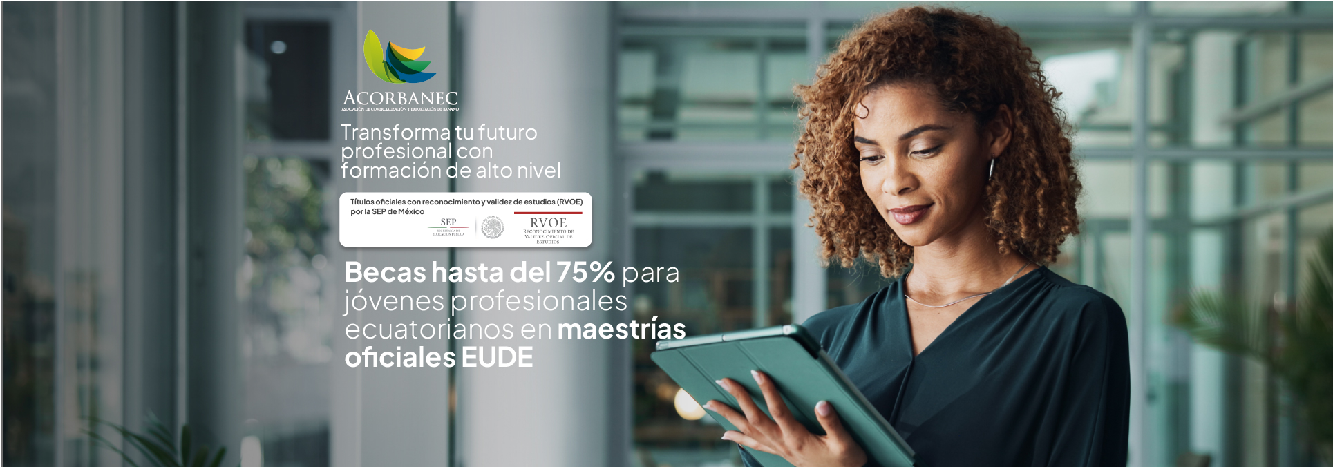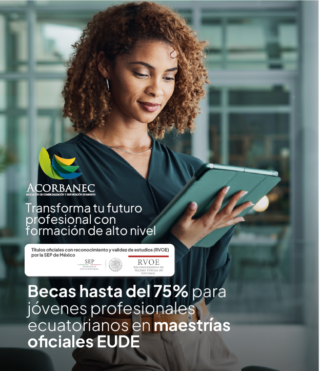 EUDE ha firmado un convenio de colaboración con la ASOCICACIÓN DE COMERCIALIZACIÓN Y EXPORTACIÓN DE BANANO (ACORBANEC), referente del sector bananero ecuatoriano, con el objetivo de ofrecer condiciones preferenciales y descuentos exclusivos en nuestros programas de maestría OFICIAL, validadas para Ecuador, para los profesionales del sector y sus familiares.