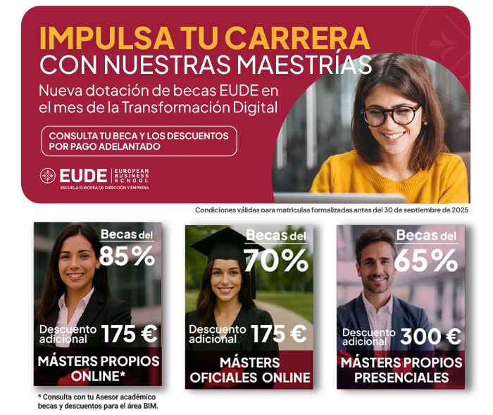 Nuestras Maestrías profesionales online, avaladas por EUDE Business School, con las que podrás obtener una BECA DE HASTA EL 75% más un más un descuento adicional de hasta 870€ en función a tu perfil y a las plazas con descuento disponible.