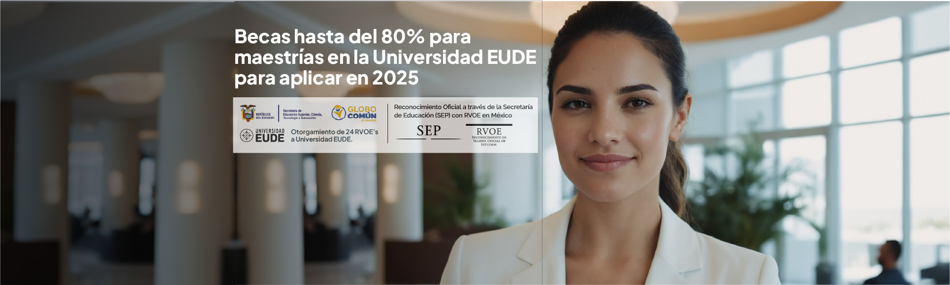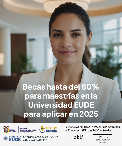 Universidad EUDE es una institución que nace con el objetivo de brindar una formación de calidad adaptada las demandas del mercado y a la creciente necesidad de acceder a programas de formación superior homologados por autoridades educativas como la Secretaría de Educación Pública de México. Universidad EUDE, y la Secretaría de Educación Superior, Ciencia, Tecnología e Innovación – SENESCYT, en el marco del relacionamiento internacional y cooperación, convocan becas parciales para la ciudadanía ecuatoriana para cursar estudios de maestrías ONLINE durante 2025, de conformidad con las siguientes bases: